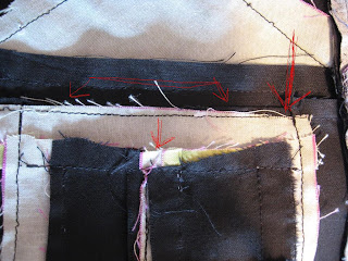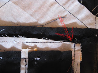 And a general bit of advice — if you are sewing on black and other dark fabrics, please do not use white thread. It will show everywhere a seam is pressed. Please use gray or something darker.