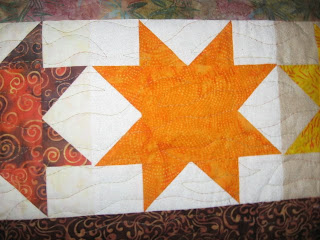 The stars themselves are gorgeous, and I had quite a hard time working out what I wanted to do with them. I played around with a lot of different kinds of settings, but in the end was inspired by a row type setting I saw somewhere else (who knows where any more) – I never really think to set my blocks in rows – don’t know why, as it can be very effective. The border fabric is a stripey batik I bought in a sale somewhere and then could never work out what do use it for, so being able to find a project it suits made me very happy.