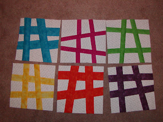 The first 3 blocks were a mess. One a total washout, because I completely miscalculated how much fabric I needed and ran out half-way through. One I may be able to salvage for myself – but the coloured strips will not all be the same width, so it’s not part of my set for this lotto. The third one was close – just missed on one corner. Finally, with number 4, I seemed to have it figured out. I completed 5 good blocks, found enough fabric to correct the 3rd one, and here are my six blocks for January. I promise that they are not as lopsided as the picture suggests – I’ll have to be more careful with my placement next time.