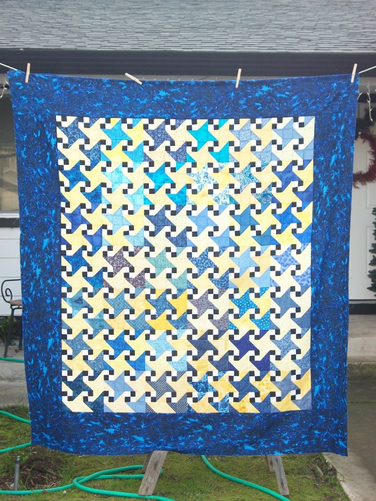 Dianah’s Starry Night Quilt Top Posted by Automagically imported from Blogspot on January 3, 2010 in show and tell | Comments Off on Dianah’s Starry Night Quilt Top I just added the borders to the Milky Way blocks I won. I love my quilt. Thank you all so much! It is going to finish at about 66″ x 74″, it is a good throw size.
