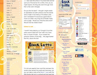 It has felt a little like spring cleaning and endlessly rearranging the furniture . . . if you’ve visited the blog on Friday, you might have seen any one of a bunch of different layouts and colors as I played with Blogger’s new Template Designer and finally got around to putting the Guidelines, FAQs (frequently asked questions) into their own pages, which are easily accessible through tabs at the top of the blog. I also added an alphabetic list of all the lotto blocks we’ve ever made, with block photos and links to the patterns we used.