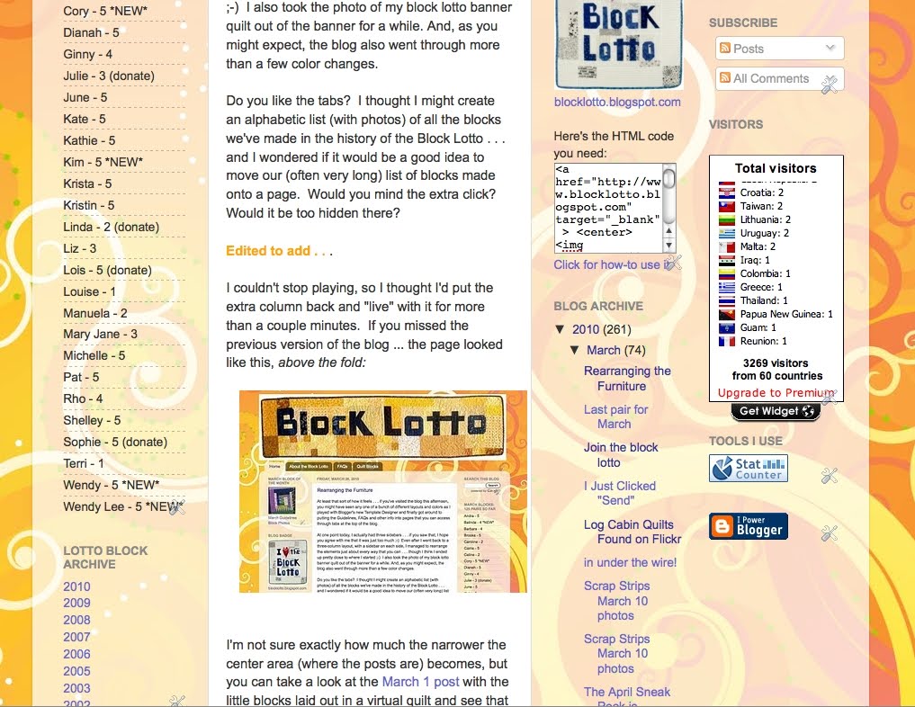 As I tried one thing, then another, I bounced between two and three sidebars, I was trying to put the info we all come here looking for “above the fold” (in the screen you see without scrolling down). I think I managed to rearrange the various elements (AKA gadgets) just about every way that you can . . . though I think I ended up pretty close to where I started 😉 I even took the photo of my block lotto banner quilt out of the banner for a while. And, as you might expect, the blog also went through more than a few color changes. Ultimately, I liked the plain blue background and this swirly yellow-orange one best and decided this template had a better definition between the main body and those pesky (but essential) sidebars.