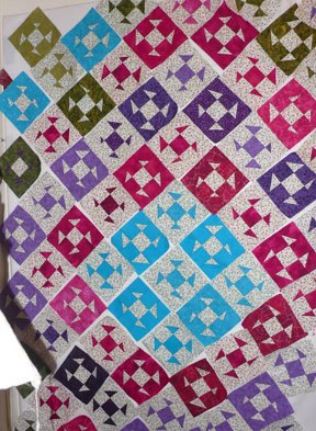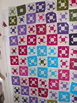 Thanks to everyone who made suggestions regarding my shoo fly quilt. A couple of people thought it would be helpful to see pix of the different possible layouts. Here’s what I was able to come up with. Sorry about the picture angle–I don’t have much room to manuever. Your thoughts are VERY much appreciated.