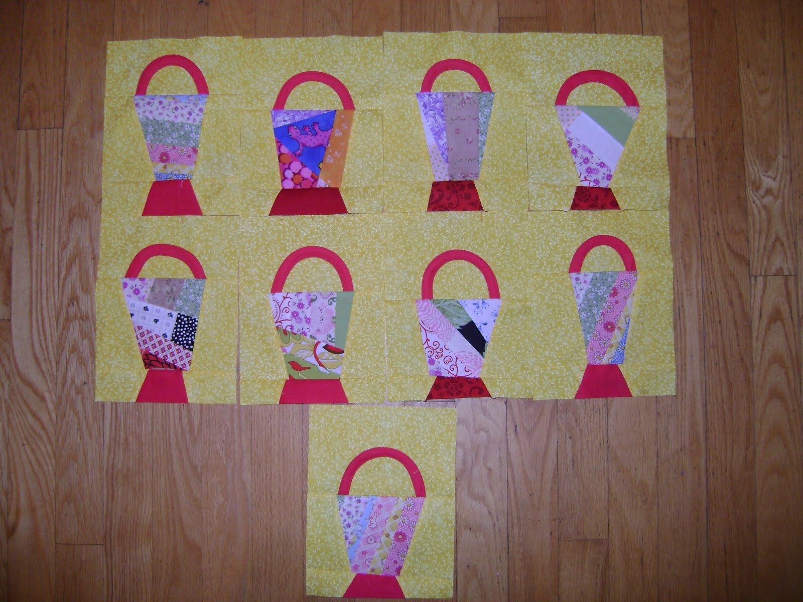 Here are my blocks for June. After I put together the basket part and the base I then read the handle part of the instructions….I didn’t have enough of the base fabric to do the handles. I had Kona red to do all the handles. This would eliminate 4 of my 9. I would like to donate my chances to someone who has been making blocks for a while and has not won yet.