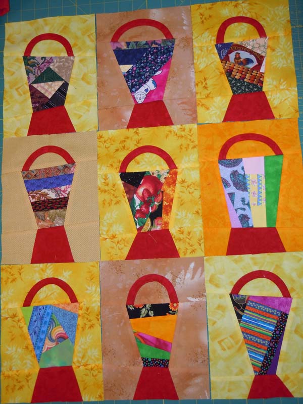Hi, I have finally gotten the second set of basket blocks finished. The first set I am keeping. I discovered that the red ran, even after the fabric had been treated to remove excess colour, and the blocks were made. The new set is made with colourfast red, so there should be no problems.
