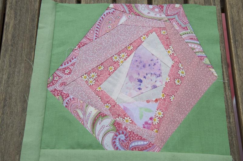After a bit of a struggle with adding the green, I came across a pretty good way to do it. I used a paper bag for the template and after I had finished the rose, I laid it down on the template and traced around it. I then folded on the line where the green would go (the triangle part and it made a pattern of sorts. I placed that on a corner of the green and then cut leaving a seam allowance. Does that make sense? It worked well for me. I was planning on cutting the paper and making an actual pattern, but was too lazy to cut more templates. I had to add some sides because for some reason when I was trimming I was thinking 9″ not 9.5″.