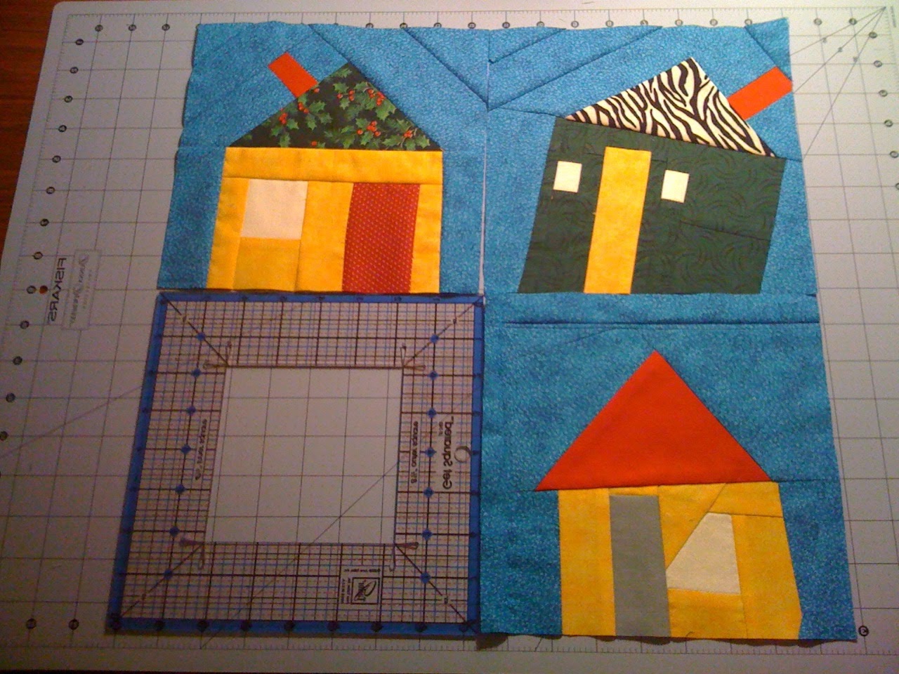 Three Houses from San Diego Posted by Automagically imported from Blogspot on September 29, 2010 in blocks | 2 comments I finally got new rotary blades – what a difference! So now I could trim up my blocks to submit them for September BlockLotto. The houses are actually reversed in this photo.