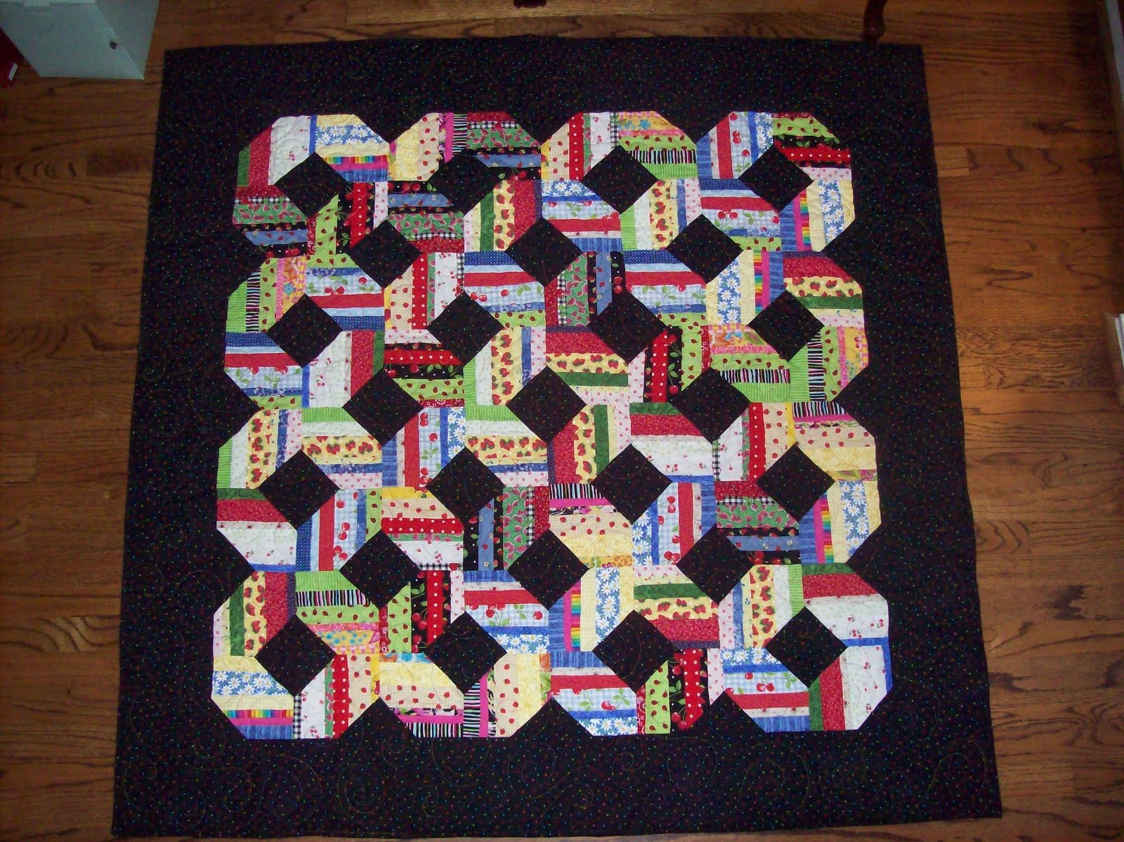 One of the first “liberated blocks” last January was the tic tac toe block. I had fun with those, and when I was finishing up a string piecing quilt top based on an Ami Simms workshop, I decided to make my backing a giant tic tac toe, to use as a bean bag toss target. As you can see, the front of the quilt is filled with prints of fruit, flowers and bugs, so I think of this as a picnic quilt.