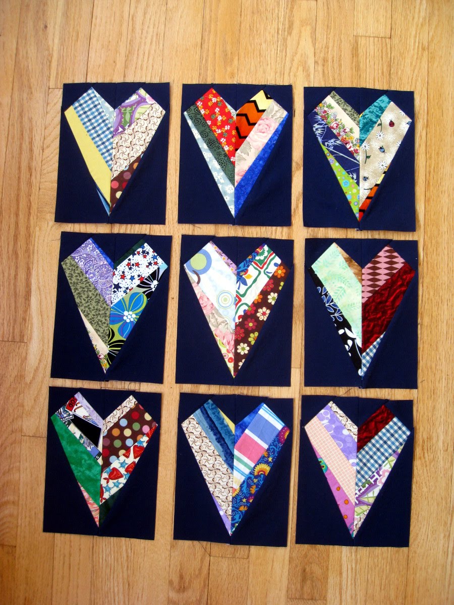 I pulled out my 45 degree diamond template and used it with four of the heart block off-cuts sewn together. I had seen Bonnie Hunter's Out on a A String quilt, http://quiltville.com/outonastring.shtml, for inspiration.