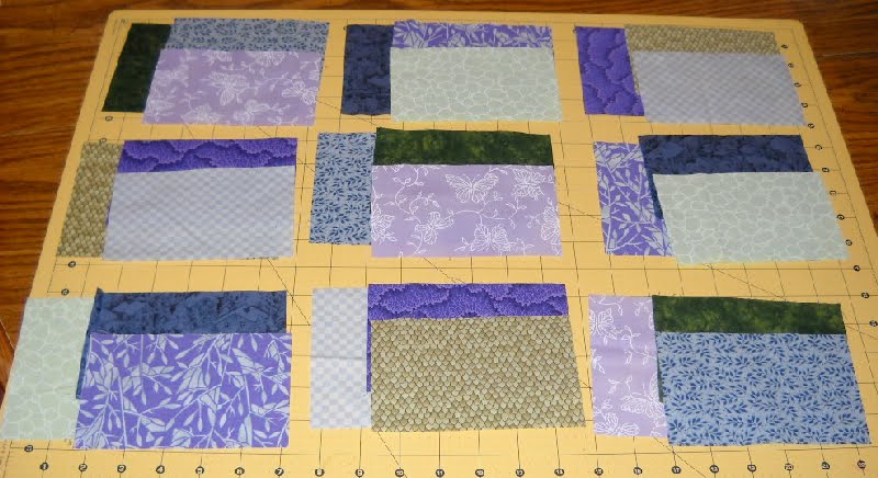 I used nine different prints: a light, medium and dark of each color (green, blue and purple). I cut 2 of the smaller rectangles and 1 large rectangle of each print and sorted them out. I wanted each block to have 1 light, 1 medium and 1 dark AND 1 piece of each color. (The medium green doesn’t look that yellowish in person.)