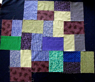 For such a simple block this sure has caused me problems. I had my nine made almost immediately I received the sneak peak. After looking at them for awhile I decided some of my purples were too red so set about changing them. Then I realised that I had used the same combination of fabrics in some blocks. Now that they are all complete I have been having trouble photographing them. One of the purples which I really like is photographing as blue and some of the paler greens are photographing as cream – I give up. I have tried them on a light and a dark background.