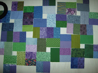 I’ve received 3 patch blocks from Cathy C, Janet S, Kathy S, Kristin, Lisa, Maree and Sophie. Just nine more to go from three lovely ladies. I’ve been playing with them and trying to figure out how I’m going to put it all together. I have a creative flaw in me – I don’t do random very well. I need some kind of color or print order or pattern. Now don’t laugh at me too hard, but I’ve got the blocks I’ve received in color order so I can see if there is some sort of order to the randomness. Here are six different possiblities and what I’ve received from each category: (top color, left color, right color)
