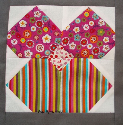 Today I did my block for the July (!) Bee I am in. One of the requirement for the block was to make a flower in the block so I thought I would use the African violet block from the blocklotto last month that I DIDN’T win as I loved that block so much and Sophie had nicely provided instructions for different sizes of blocks. I followed Ellie’s exampleof a pansy block but modified it slightly when I realised I made a mistake in the cutting!