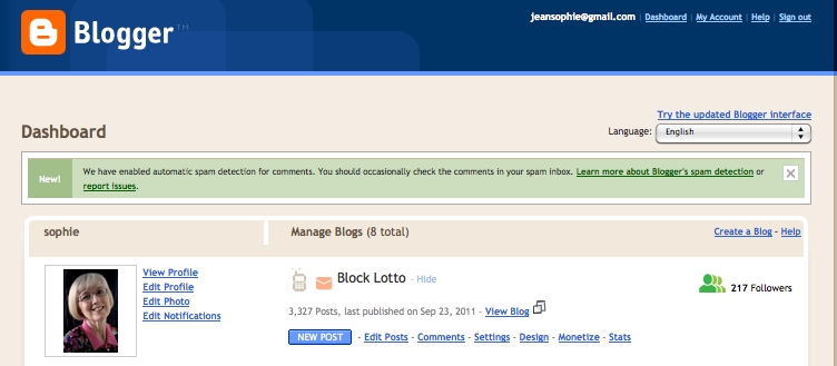 If you are already signed in to your google account when you come to the block lotto blog, you’ll see the email address associated with your google account and different links in the top right corner, including New Post and Sign Out.
