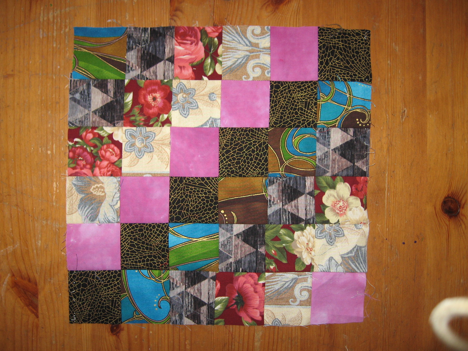 Here are my nine blocks for November – isn’t it funny how lighting in photographs can work? Blocks which are made with a black fabric (like the one below) can actually look less black than one with a dark purple fabric in the diagonal position. But I promise they do all obey the rules! I’ll donate my chances once again, Sophie. If I do this long enough I might actually make a dent in my scraps!