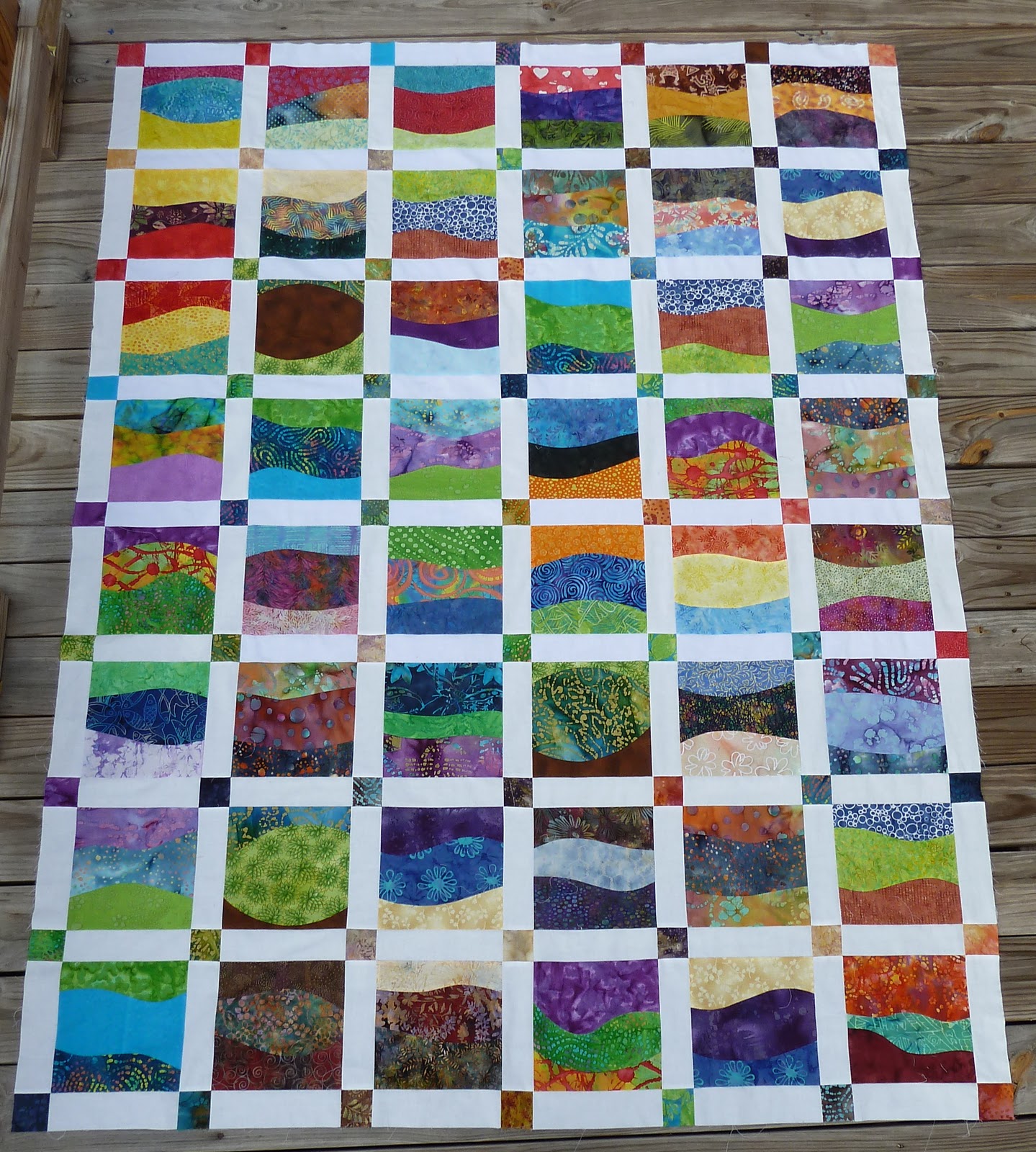 So I’ve finished piecing the top of the curved rails that I won in September. I was going to wait to share it until I’d finished it entirely, but I couldn’t wait. (I am going to wait to share the quilt I’m making from the disappearing 4 patch that I won earlier in the year. I’m almost done with it!) Anyway here is the top. You can read more about how I hope to quilt it and my practice runs at doing so, on my blog: Quilt Evolution. Let me know what you think!