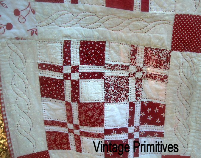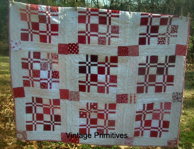 Several months back I won blocks from the Lotto. Following that I did a red/white charm swap with some ladies. I decided to incorporate them into a quilt for my Mom’s Christmas gift. It has been completed for a few months now but have had the worst time with my computer & camera lately. Anyway, here it is – it is queen size and all hand quilted. I think she will love it.