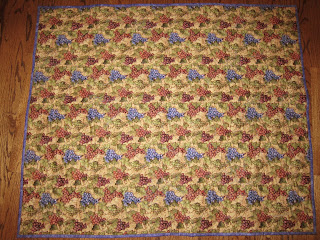 I finished assembling about half of the three-patches I won last summer into this table topper, with the addition of the wine-based fabrics in the center. The backing is 3 colors of grape bunches. My long-arm quilter did a nice job of quilting with vine and grape motifs in the blocks. This will go out to my friend who is a wine fancier, I hope this week; just need to add a label.
