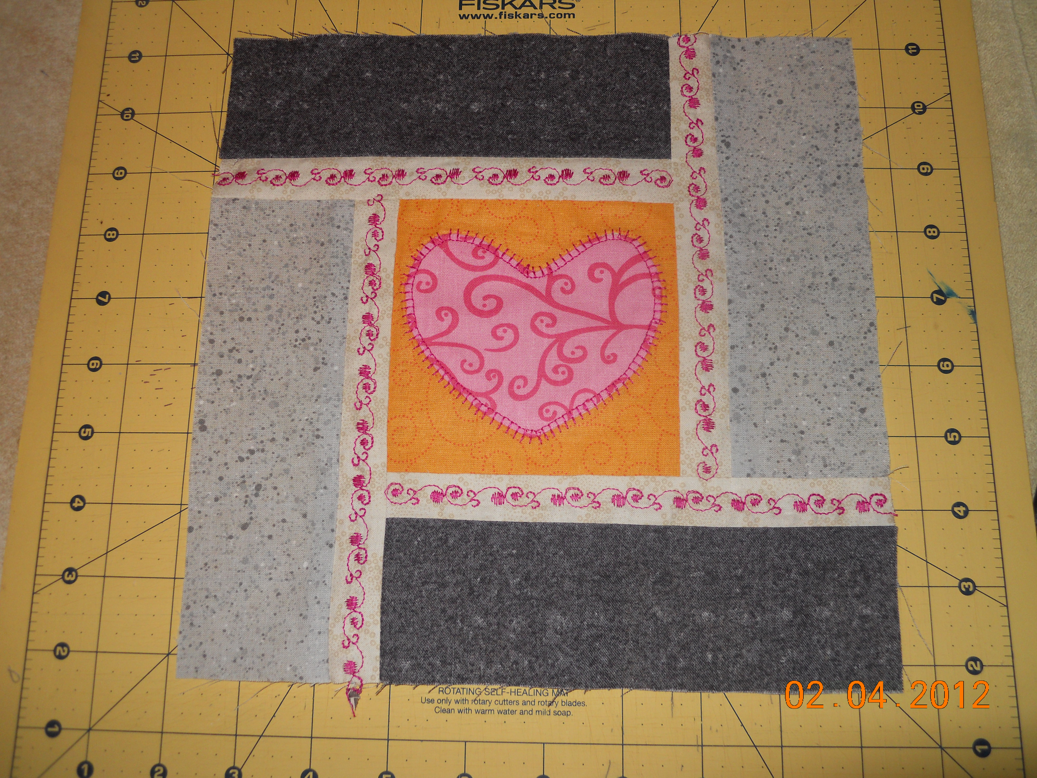2. Yes, it’s embroidery. I thought the block was just too plain. I was playing with a decrotive stich that I haven’t used yet and some Auriful thread that I won. Wow, it’s really nice thread! Thanks for the compliment.