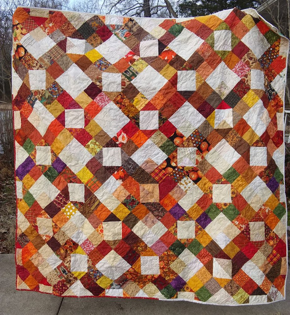 The Variation Rail blocks in this quilt are a little larger at 7 1/2 inch square–I started with 3-inch squares because I had some 3 inch strips cut from assorted plaid flannels. It made for a cuddly quilt that was especially appreciated when I was without heat for 5 days during the coldest part of what was mostly a non-winter here.