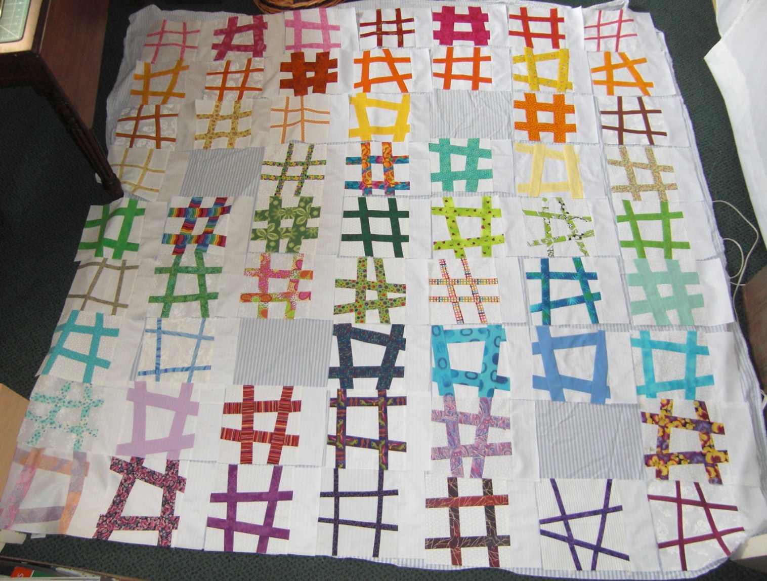 Not sure you’ll be hugely interested, but I’ve sewn on the side sashing and ordered the blocks into something I like. There’s 4 ‘holes’ as I need another 4 blocks and I can’t decide whether to make them coloured background with white hashes or not. I’ve not done the rest of the sashing as I can’t decide whether to have handdyed coloured cornerstones. Decisions, decisions!