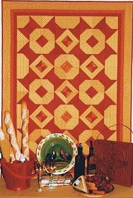 Although I don’t think this quilt was constructed that way, one could make it by putting the spool blocks on point and alternating with blocks that are quarter-square-triangles framed with strips of background fabric. At least that’s how I envisioned it when I was hanging onto ideas for block pairs for the lotto.