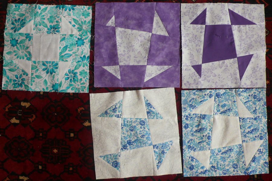 Here are my blocks for April. They are made from the 3 different techniques (which were all very clear). These pictures include the one I sent in for the sneak peek for a total of 9. I’m not big on florals, but while I was looking, I pulled out a big bag of scraps someone gave me after the death of a family member. They are neat florals in three colorways, probably from the 1950s. I didn’t include them in the lotto because I’m not entirely sure of the fiber content, but you’ve inspired me to turn them into Shoo fly blocks.