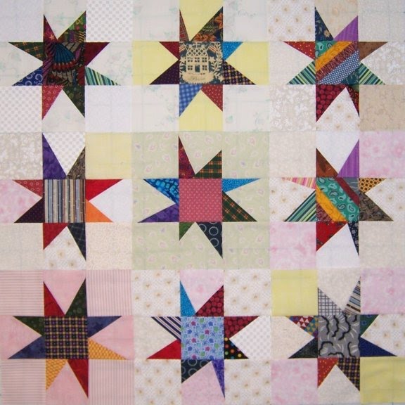 Over the last few days I have completed 8 more Star Blocks for this month, bringing my total to the 9 pictured below. These are fun blocks to make and I restricted myself to not cutting into FQ’s or yardage but using scraps only. I’ve learned that rotary cutting uses abdominal muscles to some extent, less so if done sitting down….I’m still a bit sore, but doing so much better one month out from the surgery. Still a few more weeks of restricted lifting to avoid a hernia, but I’m starting to do a bit of housework including laundry and hanging it on the line, but the kids get to carry the baskets for me. Tomorrow I get to go grocery shopping, as I can drive now (my 17 yr. old son has been taking care of that for the past month). And 33rd Anniversary date with DH tomorrow night