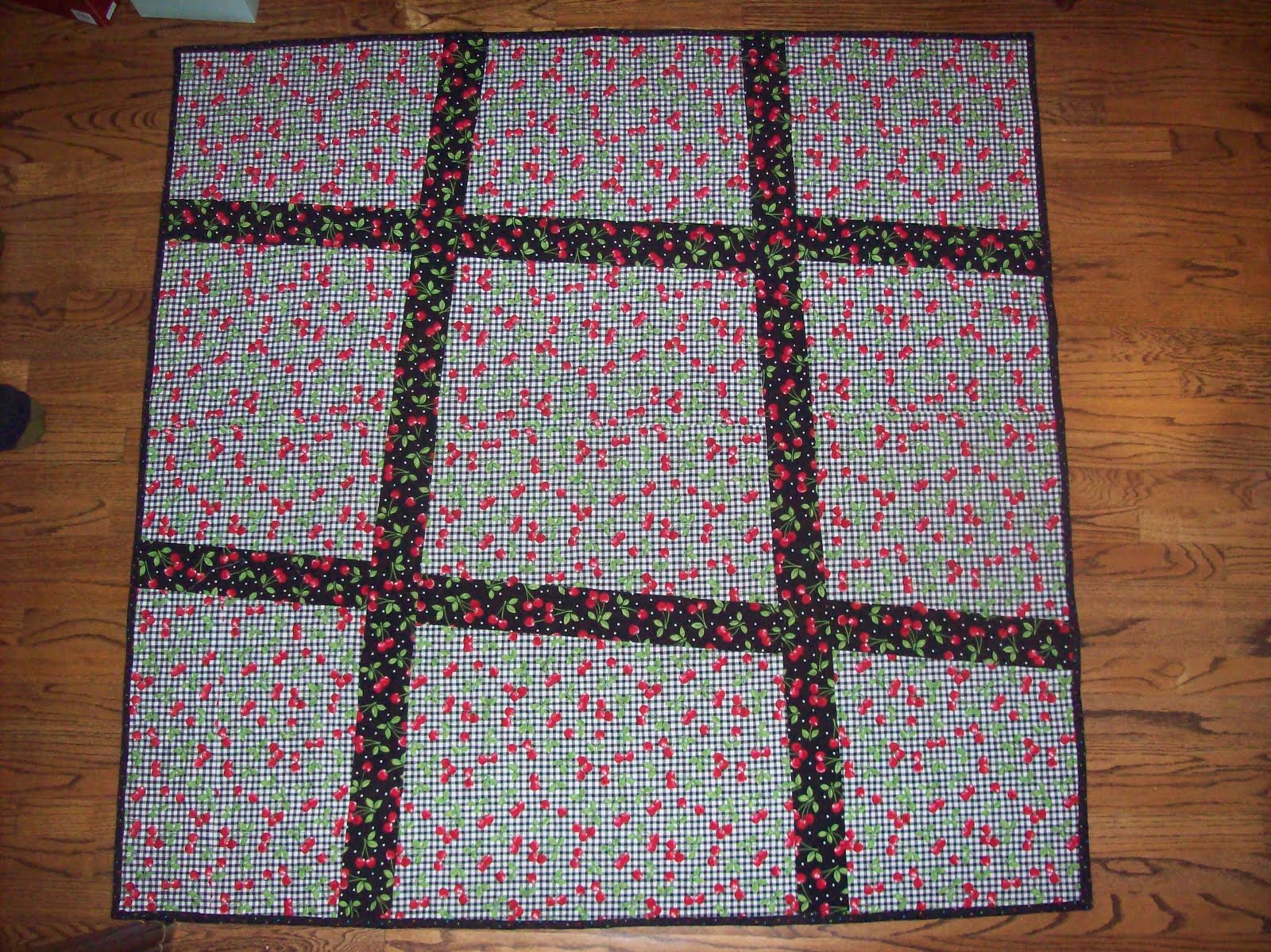 One of the first “liberated blocks” last January was the tic tac toe block. I had fun with those, and when I was finishing up a string piecing quilt top based on an Ami Simms workshop, I decided to make my backing a giant tic tac toe, to use as a bean bag toss target. As you can see, the front of the quilt is filled with prints of fruit, flowers and bugs, so I think of this as a picnic quilt.
