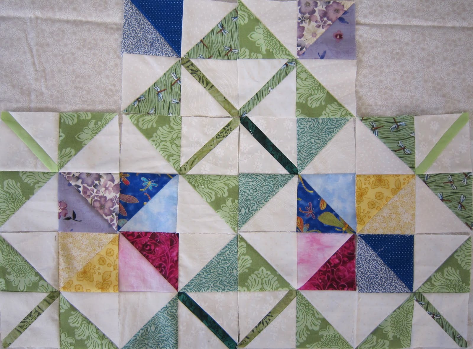 Here are my 10 blocks for April including the 4 I sent through from the Sneak Peak. I started playing with the layout and discovered this one – it obscures the blossom motif but I like the pattern that has emerged. Laurina