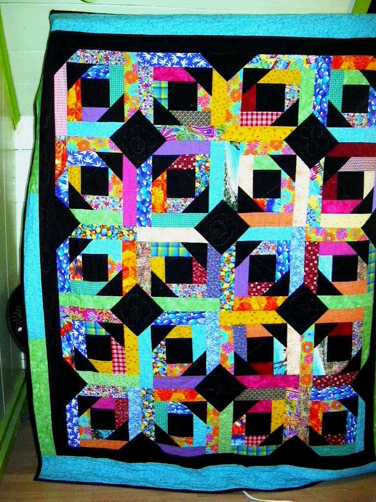 Here are my nine blocks for May. I really like the looks of this block. I’m including a picture of a quilt I had made 5 yrs ago when my youngest turned 15 and we had a bedroom redo for her…I did hers with brights on black using 2.5″ strips instead of the 2″strips we used for our lotto blocks. The color isn’t great, but you get the idea. I’m not too fond of black quilts for myself, so am ever so happy to have the white background for these. I so want to win this month!