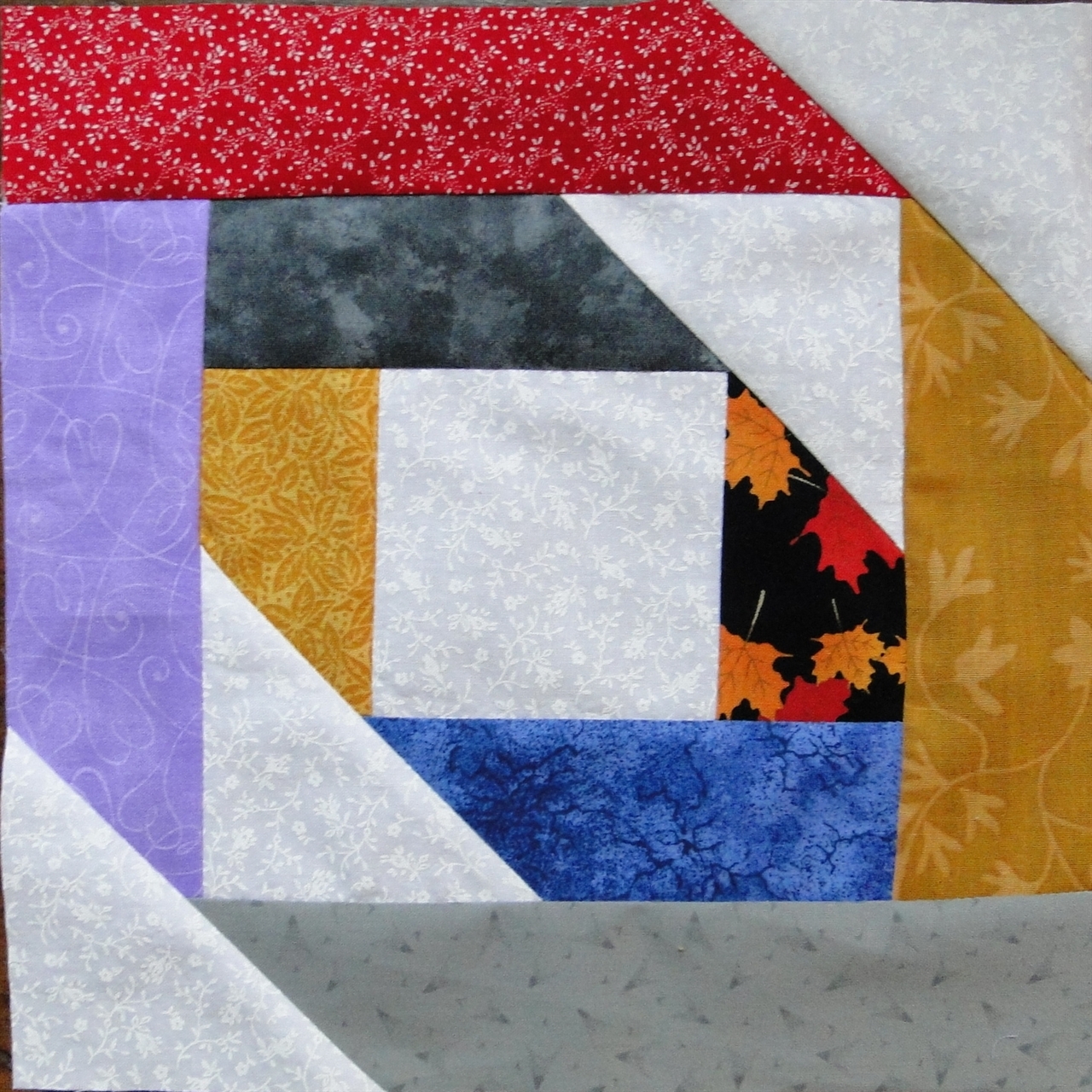 Whew – squeaked at least one block in for this month. I finally found a few moments, and then fretted that I didn’t have any grey fabrics…and then went looking. Found two greys and was on my way!