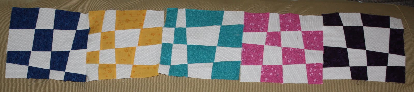 Here are my five (5) pairs for ten (10) blocks. The really dark color is actually a deep purple, but the others look ‘true’, more or less. The white for all of them is a white-on-white pin-dot.
