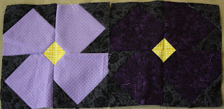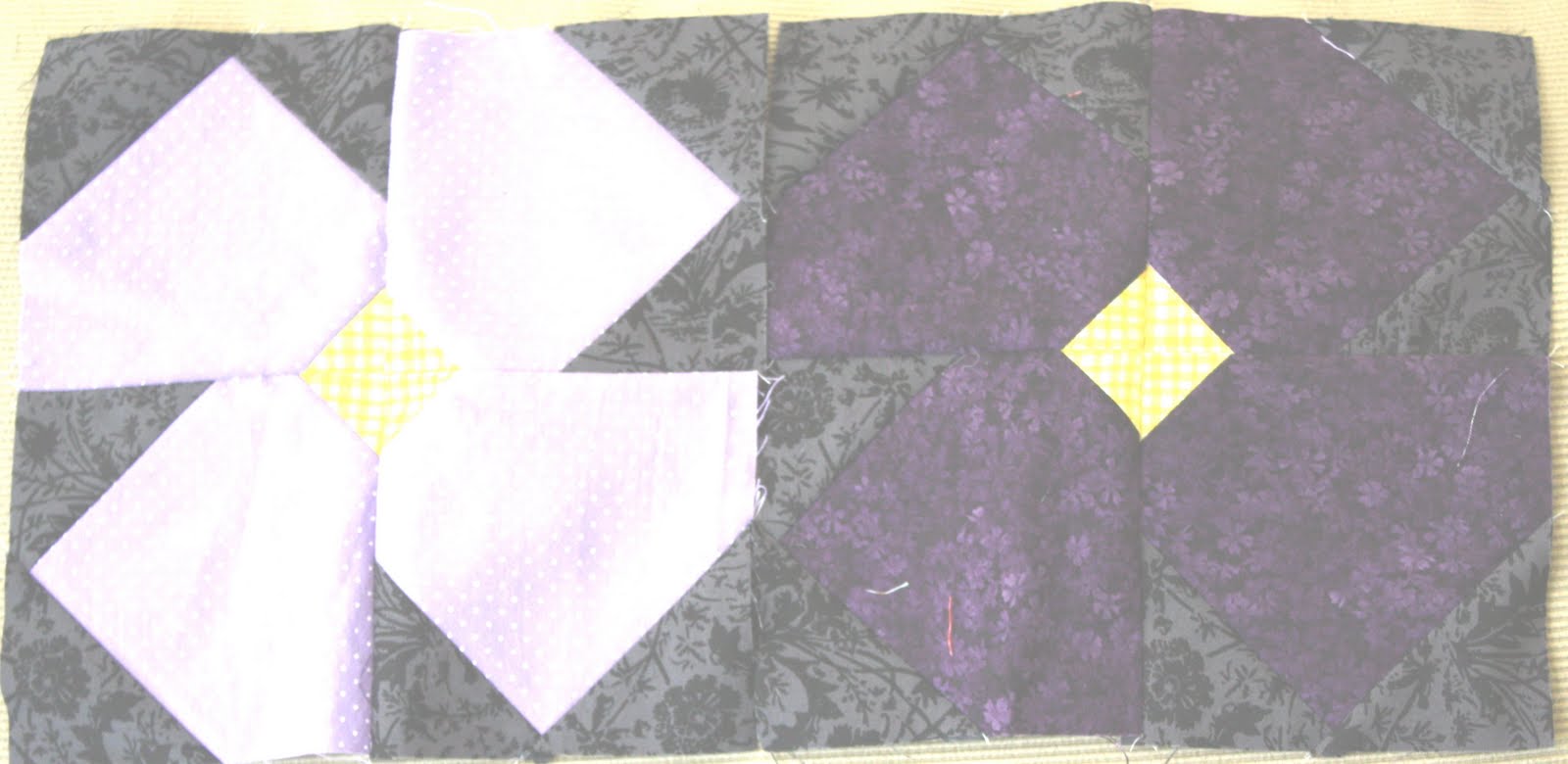 I promise, the flower on the left is purple. It is the same purple I used in my JUL blocks, which also looked black. So I took the same photo & dialed down the saturation & got: