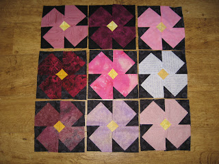 Anyway. These are my nine violets – I loved doing this block and will definitely be doing it again in a different colourway (not sure what colourway, I can think of tons of options from a Christmas theme on a cream background, to batiks on black, to florals on neutrals, to pinks on green backgrounds, to…) – as usual, Sophie has picked a block which is not only great in the fabrics chosen for the lotto, but which provides so many other possibilities as well (and the handy size chart means I don’t even have to do the calculations myself if I want different size blocks!).