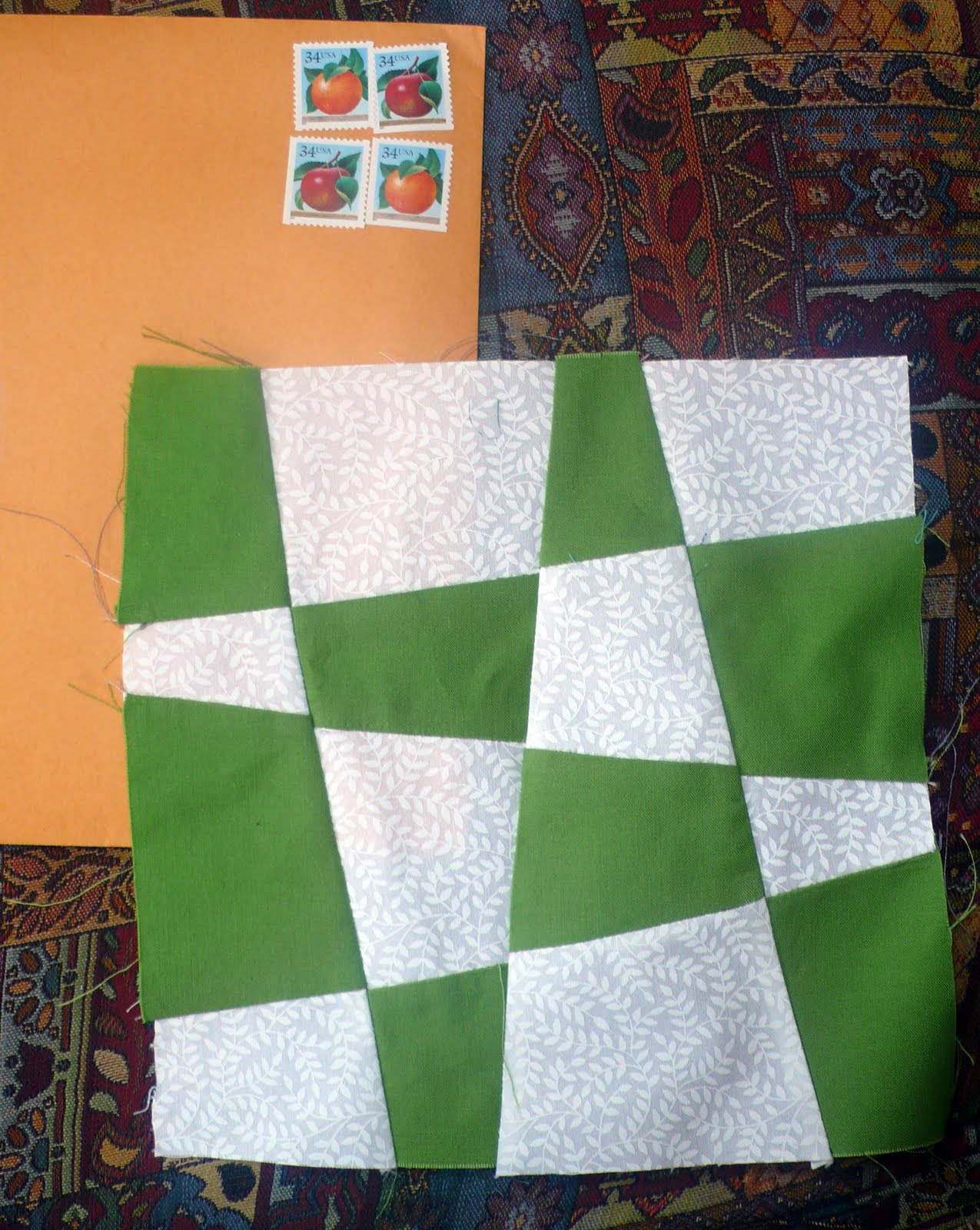 I put the packages in the mailbox tonight. When making my under-the-wire blocks, there was a pair I missed up, but couldn’t fix in time for the deadline, so they are in the packet as well. Fittingly they are green because I am green with envy that you guys won the blocks!