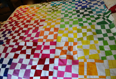 I realized this morning–when I finally went to the post office and mailed my checkerboard blocks that you don't have all your blocks yet … because 2 of mine are on their way to you. Maybe they can become back art for your fabulous rainbow quilt?