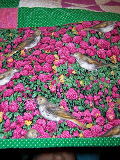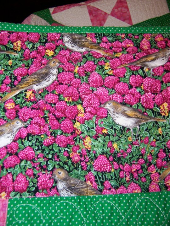 I thought I would work on the October sneak peek blocks, but on Sunday my husband mentioned a girl who works with my daughter Katy, whom he had been visiting with a while back and discovered that she had no memories of birthday gifts growing up, except one time she was given a comb. She has had a hard life. Anyway he thought it would be nice to give her a gift for her birthday, which is tomorrow. My thoughts immediately went to a quilt as a gift. I remembered I still had some of the Sept. 2007 lotto blocks I had won…pink/ purple Ohio Stars. Katy said Kayla would like pink. I also had border fabric in mind with pink flowers and birds on it and Katy said Kayla like animals, so I decided I would do it. From the start this quilt has just been meant to be. I pulled out the blocks and the border fabric and decided a green sashing would be best. Right on top of my greens was the perfect green with white dots…enough for sashings and binding. Then I found a scrap of a pink that was great for the cornerstones. By bedtime Sunday it was all cut and up on the design wall. Monday was community quilting day for guild so I was gone most of the day, but I sewed after I came home in the evening and had it all sewn together but the top and bottom borders. The border fabric is a standard 44″ width. Being a very directional print and fairly large at that, and the quilt being 62″ wide I needed to piece the fabric for those borders. I wanted to match the designs in the fabric. Amazingly it went together perfectly on the first try…..the seam runs right down the center in each of these pictures of the border.